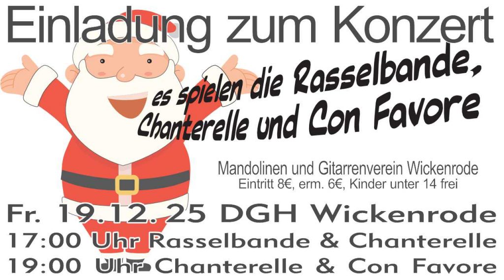 Einladung zum Weihnachtskonzert Beitrags-Autor:Admin Beitrag veröffentlicht:25. November 2025 Beitrags-Kategorie:Ankündigung Lesedauer:0 Minuten zum Lesen Schlagwörter: Con Favore, Kinderorchester, Rasselbande Weitere Artikel ansehen Vorheriger BeitragErste Kinderorchesterprobe zum Sommerprojekt „Die Schildkröte hat Geburtstag“ Das könnte dir auch gefallen Ensemble aus Con Favore fährt nach Berlin 13. Mai 2025 Herzliche Einladung zur Jahreshauptversammlung mit Wahl! 11. Februar 2025 Mandolinenkonzert von Johann A. Hasse mit Lorenz als Solist im Friedrichsgymnasium Kassel 6. März 2023