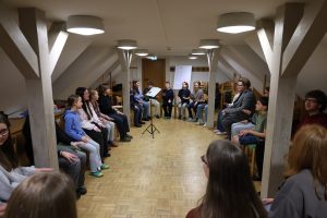 Nach dem Mittagessen gab es eine längere Pause, in der die Jugendlichen entweder den Spielplatz oder die angrenzende Gegend ein wenig genauer erkundet haben, bevor am Nachmittag weiter geprobt wurde. Abends gab es dann noch die traditionelle Hausrallye, in der musikalisches Wissen unter Beweis gestellt werden musste, Aufgaben erledigt werden mussten und Fragen zum Haus und den Betreuern beantwortet werden mussten. So haben wir zum Beispiel gelernt, dass Lorenz gerne „Grüne Energie“ Tee trinkt, Wolfgang 1998 einen Käsehobel als Souvenir aus Schweden mitgebracht hat (der wohl auch immer noch bei Familie Lorch im Einsatz ist) und Sebastian durch den Füllerführerschein gefallen ist. Außerdem wurden sehr viele Bilder gemalt.